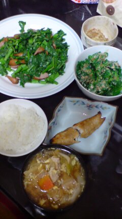 ソーセージとなばなの炒め物。ざっとゆがいたなばなをきざんで、ついでにソーセージも刻んで、いっしょにいためて塩コショウで終了。卵も入れようかと思ったけど、水餃子スープに卵が既に入っているのでやめ。