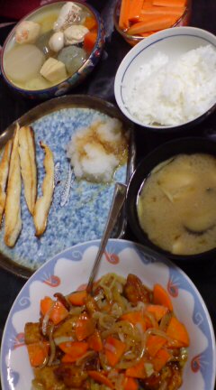 今夜の夕食。…よくみると野菜は使ってるけど緑色のない食卓だわ… orz