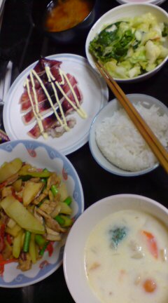 本日はなぜか二汁三菜の豪華食卓。…というか、明日は職場に泊まり込みで仕事してこようと思ってるので(ちょっと少々本日ブチ切れてマジ)、シチューを作り置きしたのでした。