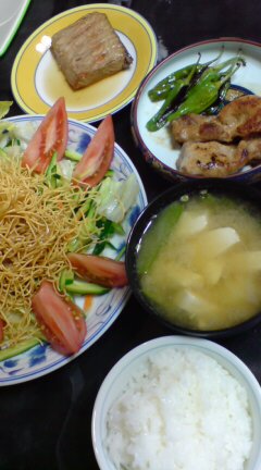 菜3:サラダ用パリパリ麺というのを買ったので、ありもの野菜と合わせてサラダ、冷蔵庫からレタスを使い切り、その他きゅうり、にんじん、トマトに麺をもりつけて焙煎ごまドレッシングでうま~。