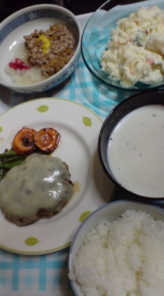菜1:ハンバーグ。生のタネを買ってきて焼いただけ~。冷蔵庫から取り出した人参といっしょに買ってきたインゲンを一緒に焼いてつけあわせ…しまった!キノコがいっぱいあったのにつけ忘れた!そうそう、とろけるチーズも在庫処分。あと1枚w