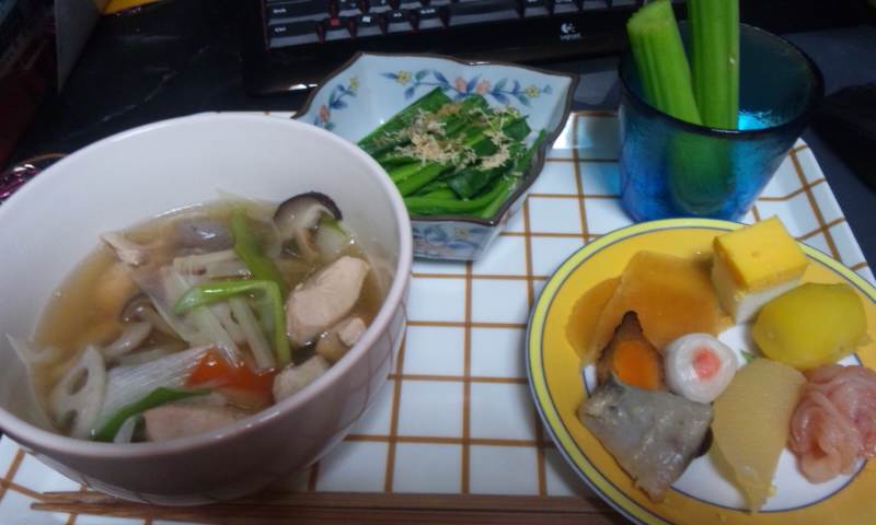 汁物:お雑煮。最近鍋用スープが売ってるので、「これに根菜ぶち込んだらお雑煮いけるんじゃね?と思って試してみましたー。しょうゆベースの鍋スープに、鶏胸肉、大根、人参、ごぼう、レンコン、しいたけ、しめじ、こんにゃく、長ネギ。味付け見なくていいしすごい簡単。なべ用スープのパッケージには「白菜」とか「白身魚」とかいろいろ書いてあったけどそんなもの見ない。根菜は硬いので小さめ拍子木とかに切って、沸騰したら弱火にして20分くらい火を通したらできあが…ああっ!ちくわ入れればよかった!