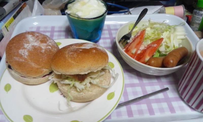 主食:グラハムロールを買っておいたので、サンドイッチ2種類。ひとつは昨日焼いたレンジ焼き豚&千キャを挟んで焼き豚サンド、もうひとつはシンプルにブルーベリージャムサンド。