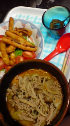 本日はミニクエストなり。昨日のタンタン鍋ののこりをあっためて、ゆでた中華麺にかけてタンタンメン、お惣菜コーナーでいかのカレー揚げを買ってしまったのでそこに水菜とミニトマトをそえて、さらに「がごめ昆布」。