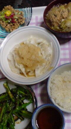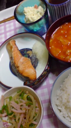 一汁:お味噌汁。久々。具は大根、油揚げ、長ネギ。油揚げは冷凍刻み油揚げを生協さんから買ってみたのだけど、うん、これ、手軽でよろしい。