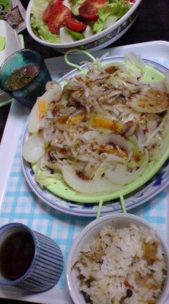 菜1:豚肉と野菜蒸し。シリコンスチーマー大活躍。油を使わないからヘルシーですよ!これでこの分アイスクリームを余分に食べても大丈夫だよね!(いえ、多分駄目です)