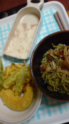 菜1:オクラの天ぷら。小麦粉じゃなくて片栗粉で素揚げ風味。おそばのお伴に。
