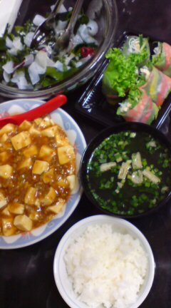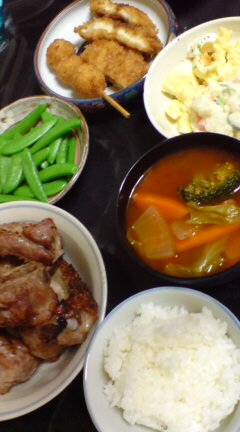 昨日はお惣菜系の夕食で、しかも量が多かった。で、あまりものを交えて本日は豪華食卓となりました。げぷー。そんな一汁多彩。三菜じゃなくて多彩。生産調整が必要です。