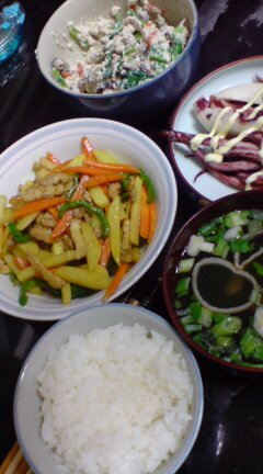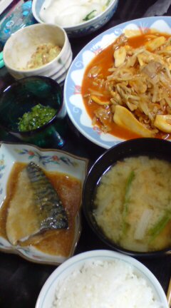 今日はお休み。冷凍庫に鯖のみぞれ煮があったからそれをあっためてー、あとはお味噌汁とー、…なんかボリューム少な目…?とかぼんやりやってたら品数がなんか多くなりすぎたw