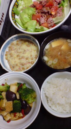 菜1:いかとなすのガーリック炒め。生協さんの冷凍食品。量がちょうどよくてラッキー。そして凍ったまま調理できるのはいいね!解凍してから調理するタイプだと、朝冷蔵庫にうつすのを忘れるよね!