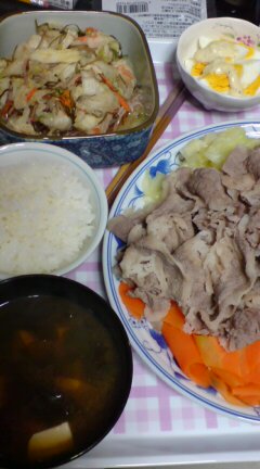 菜2:昨日半分残しておいた豚肉と冷蔵庫からもやし(コンプ)、にんじん、長ネギ(コンプ)、しめじを入れて肉野菜炒め。味付けはオイスターソースと豆板醤。両方使うと味がしまってなかないけます。