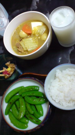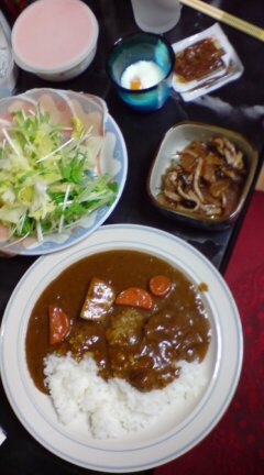 菜1:カレー鍋。セットの豚肉と肉団子、そのほかに冷蔵庫からにんじん(使いきり)、豆腐(残りミニ1つ)、エリンギ(使いきり)白菜(使いきり)たまねぎ(使いきり)…とだいぶ冷蔵庫がすっきり風味。明日鍋を食べきって秋保温泉に行くのじゃww