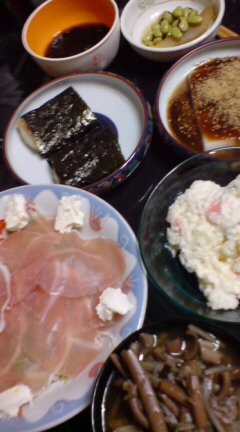 菜2:生野菜と生ハムのサラダ。これもあけてもって封を切って並べただけずら。…あ、フルーツ入りのマスカルポーネがあったので、ディップ代わりに周りに置いてみた。生ハムにチーズと野菜をくるくる巻いてウマー。