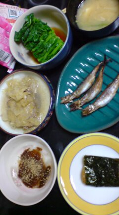 今日は豚薄切り肉の残りを消費して豚汁。その他、冷凍庫に鶏モモの照り焼きがあったのを取り出して解凍を始めたんだけど、そっちは明日のイブ献立にしよう。…もうちょっと和食風に…とか考えていたら、ちょっとボリュームに乏しい献立になりましたとさ。そんな本日の一汁三菜。
