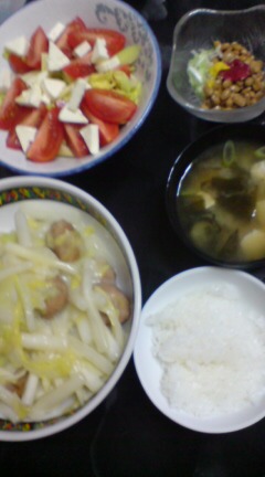 菜2:サラダ。ありもので。ミニトマトとセロリ、そしてチーズ2切れを刻んでトマト酢で。…もうちょっと主張の強いドレッシングのほうがよかったかも。チーズの味が浮いてる…。そしてセロリの葉っぱばかりが残るw