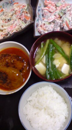 菜1:煮込みハンバーグ。一昨日目に付いたので買っておいた生ハンバーグと煮込みハンバーグソースで15分。