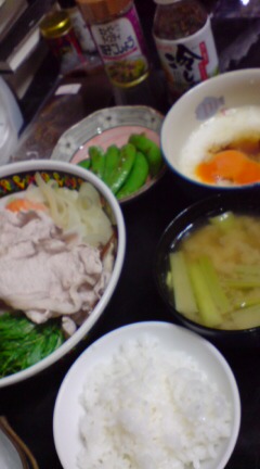 明日もやや遅い帰宅の予定。豚肉と水菜、玉ねぎとにんじんがあるからささっとしゃぶしゃぶ…あとは長いもと卵でごはんにずるずるトッピング、スナップエンドウを油炒めにして箸休め…なら早く食べられそうな感じ?