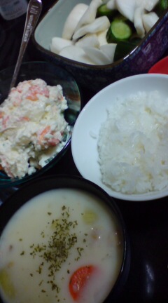 菜1:かぼちゃポタージュのポットパイ。いや、数日前に遅くなるんであっためて食べるように買ったんだけど旦那が食べなかったんだ。整理整理。でもけっこううまうま。