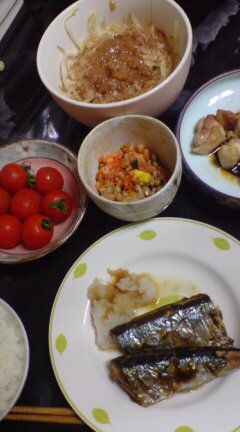 献立その1、サンマの塩焼き。ごはんを炊きながらしっかり塩を振って時間をおいたので、けっこう上手に焼きあがりました。ビバ!日本人のソウルフード(魂のほうであって韓国のほうじゃないよ)!付け合せには大根おろし。あと5cmほどで大根も終了。