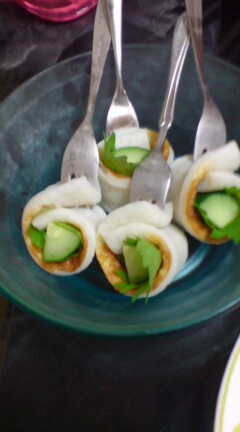 献立その6、きゅうりと大葉のちくわ巻き。・・・あると思った爪楊枝がなくて、フォークをぶっさしてきる羽目に… orz