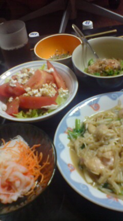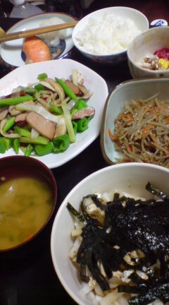 献立その2、大根とカッテージチーズのサラダ。水にさらした大根とカッテージチーズ、刻み海苔、ごま油におしょうゆでいただきます。…ごま油がいまいち古いのがまるわかり…orz