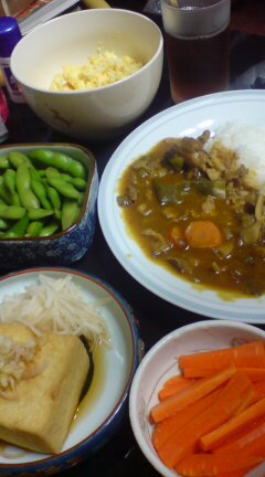 献立その3、ハム消費シリーズ、2つめのパッケージを開けて焼き豚の消費開始。刻んだ焼き豚、ピーマン、長ネギ、アスパラ、そして懸案だったきのこ消費も兼ねて生しいたけで。軽く炒めて水を入れて蒸し焼きに。味付けは中華味。中華調味料は楽でいいよママン…!
