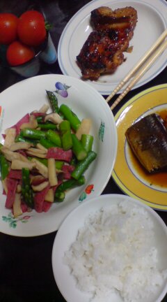 献立その2、アスパラとエリンギをいためて中華味…お肉がなかったのでハムを入れる。