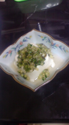 献立その4、冷奴。暑いと豆腐を簡単に食べられていいよねw冷蔵庫に残っていたみょうがと大葉をトッピング。めんつゆ(昆布タレ系)で甘めに。