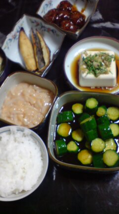 献立その2、きゅうりのぴりから浅漬け。冷蔵庫に残っていたきゅうりとふと見ると安売りコーナーにあったぴりから漬けのたれで。…しかし、スーパーの安売りコーナーって珍しいものを見つけて買うことがよくあるんだけど、あそこで買ったからといって普段買うものを買わなくなるわけではないので、家計の節約になんら貢献してないなあ…ということに最近気がついた。(駄目主婦宣言)