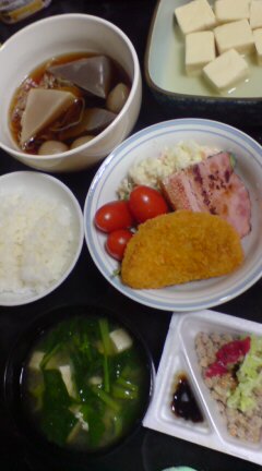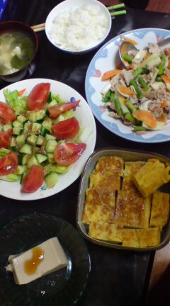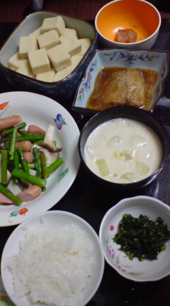 献立その6、左奥は高野豆腐の煮付け。明日のための保存食その2(その1はチャウダー)w