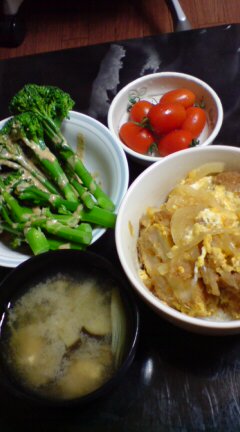 献立その3、真ん中左はアスパラとウィンナーとエリンギの炒め物。アスパラがまだなくなりません。…やはり2人暮らしで大容量パックは無理がががががが…こっちはあっさりハーブ塩味。