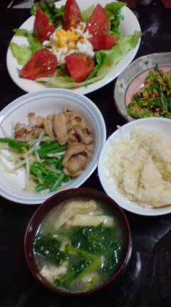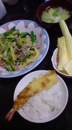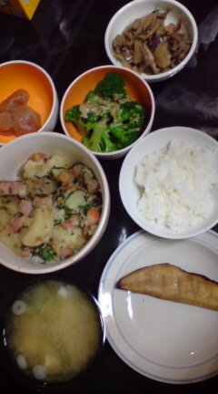 献立その1、手前右は温野菜。うっかり買いすぎたアスパラを何とかしようと温野菜。トッピングはマヨネーズで。あ、でもブロッコリーも入ってるよ。そのためにブロッコリーを買って野菜が増えて本末転倒気味w