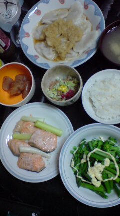献立その6、奥左は水餃子。…宴会の日に旦那が作って食べられるように買っておいたんだけどまるっと残っていたのを発見して急遽メニュー変更。…単にゆでるのは味気ないのでだいこんをおろして大量トッピング。うなれジアスターゼ!