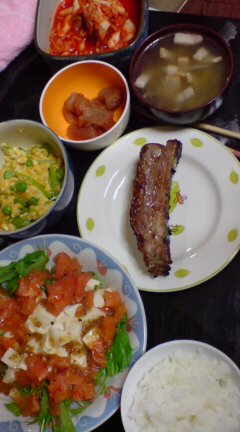 献立その2、真ん中右の皿はスペアリブの山賊焼き。味付き1本98円でがっつりボリューム!油がすごそうなので油が落ちるようにグリルで焼く。にんにく胡椒が効いててうまうま。