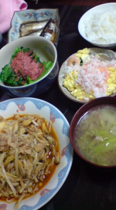 献立その4、左上から2番目…冷凍庫に辛子明太子があったので解凍したけど、今日のメニューには余計だったかも…。