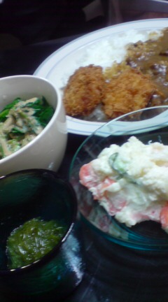 献立その1、手前右は豆腐とトマトと水菜のサラダ。3つとも刻んで重ねて玉ねぎドレッシングで。楽々しかもウマーで満足w