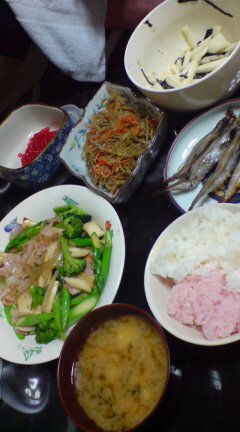 今日はご飯が足りません。入学式でもあったので、赤飯を買って来て食卓~。