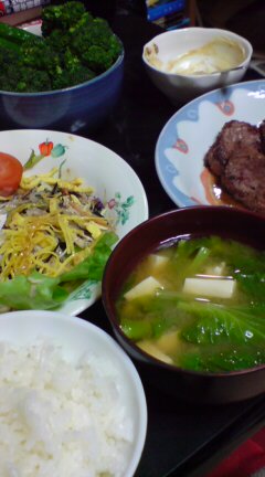 手前右。炒め物に使う気満々だったはくさいなだけど、結局味噌汁の具に。青菜とお豆腐しか入ってないのに妙に具沢山。まあいいか、おいしく飲めましたw