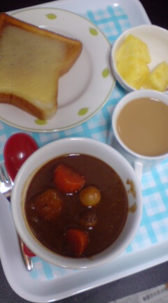 昨日のビーフシチューと、買っておいたパンと冷蔵庫のとろけるチーズでチーズトースト。珈琲はドリップしてカフェオレに~。あとはカットパインをデザートに。緑黄色野菜、淡色野菜がないなあ。