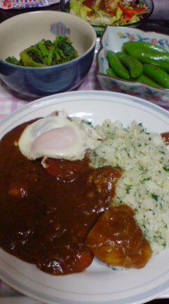 まずはビーフシチュー、これで鍋の中身は終了。昨日うっかり買ってきたパセリが3本もあったけど、とりあえず一番大きな1本の葉を刻んで、バターでいためたご飯に混ぜ込んでパセリライス。あとは、目玉焼きを焼いてトッピング。これでもうワンプレートランチですよ。ディナーだけど。