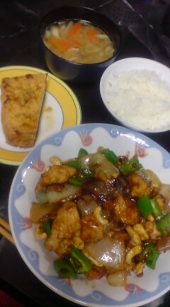 鶏肉とカシューナッツの炒め物。セット物の冷凍食品が冷凍庫にあったのを思い出してそれを利用。玉ねぎ1個とピーマン2個で野菜増量。
