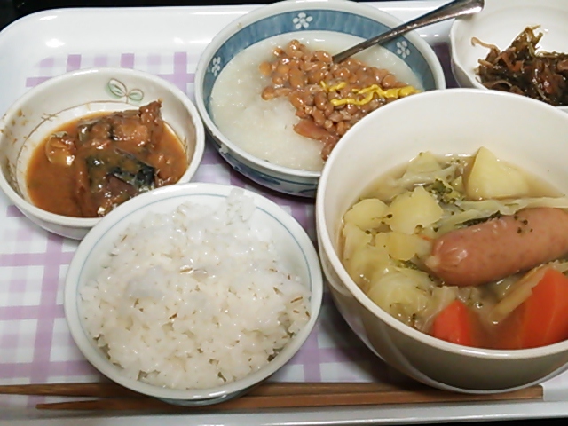 一汁:ポトフ。昨日はがっつり盛だったが今日は控えめに。…というか、結束パスタ100gは中年には多いんじゃ!日と束80gの結束パスタがあったらそっちを買うのに!(自分で計れよ)