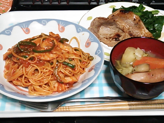 ポトフ残りとの組み合わせを考えて、本日はスパゲティ…と思ったら冷蔵庫に肉が!そんな食卓。