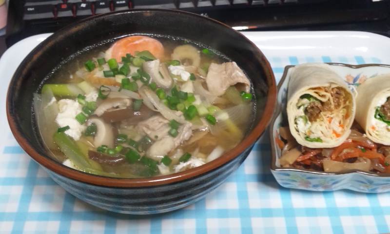 一汁:お味噌汁。例によって具だくさ~ん♪打ち豆、にんじん、ごぼう、白菜、しいたけ。