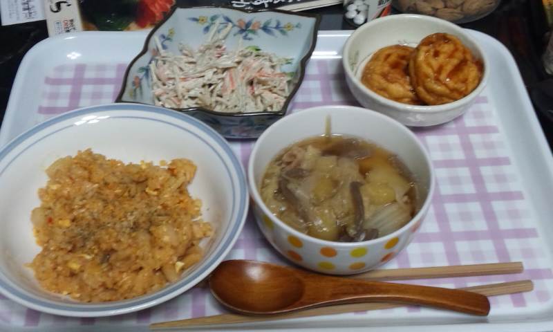 一汁:お味噌汁。スナップエンドウ、にんじん、しめじ、かまぼこの残り、おぼろ豆腐をイン。おぼろ豆腐はスプーンですくって大き目でたゆんたゆん。