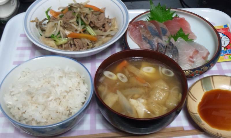 主食:例によって麦ごはん。お米1合+麦1/3合、お水1合分+100ccで炊いているので少々押麦率高め。これで理論上は1.3合出来上がり、それを夕食2人分+旦那の昼ごはんで3等分しているので、普段のご飯が微妙に少なくなっているはず…合理的にカロリーセーブできているといいなあ(でもおかず作りすぎたら台無し)。