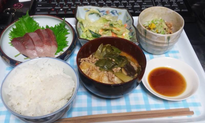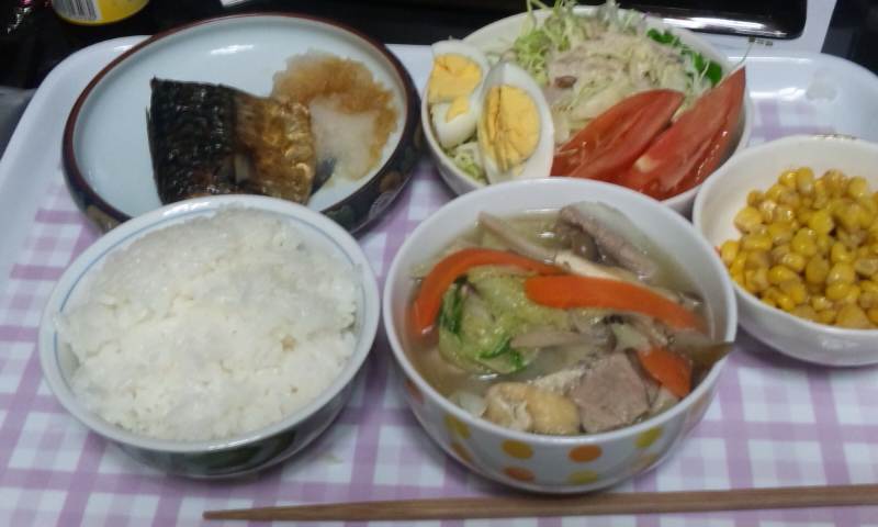 ああ、でも煮物(鍋)、焼き物(鯖)、生もの(サラダ)、炒め物(コーン)とそこそこバランス取れてるのかも。鯖の残りは明日…味噌煮…しょうゆ煮…うーん。