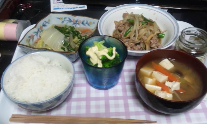 一汁:寄せ鍋。寄せ鍋スープに、在庫いろいろぶち込み鍋…でも正しく寄せ鍋じゃね?豚肉、ごぼう、にんじん、しめじ、白滝、油揚げ、白菜、水菜、長ネギ。うむ、手軽にて美味。冬の鍋は正義!