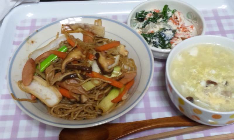 菜2:野菜サラダ。朝食用に買っておいた生野菜サラダ(千切りキャベツ、スライスたまねぎ、サニーレタスのセット)にカットしたトマトとゆで卵をそえてオニオンドレッシング。いい感じだったんだけど、鮮度が落ちたせいかスライスたまねぎがちょっと辛かった。硫化アリル恐るべし。
