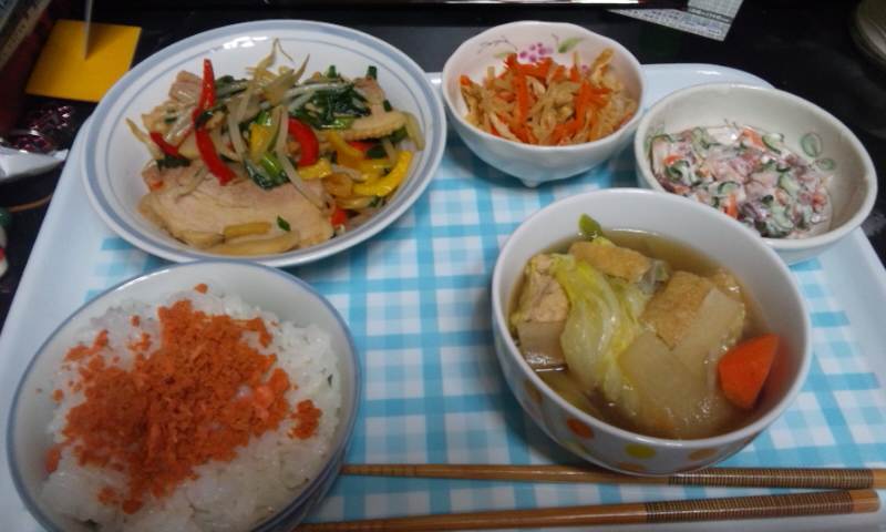 今日は昨日の汁物を使いまわすでござるの巻。ついでに冷蔵庫の茹で野菜もちょっと整理。そんな一汁三菜。